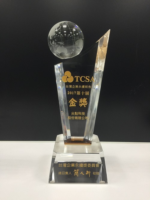 尖點科技參加由財團法人台灣永續能源研究基金會舉辦的「2017 TCSA台灣企業永續獎」,繼前一年於永續報告類獲得「電子資訊製造業 – 銅獎」,2017年續創佳績獲得「電子資訊製造業 – 金獎」之肯定。