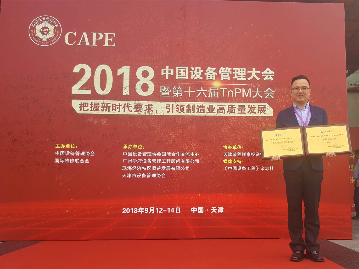 上海尖點在2018中國設備管理大會暨第十六屆TnPM大會中,分別獲頒「設備管理金點子二等獎」與「企業現場管理看板組織二等獎」。上海尖點係以較前次更優秀的成績再次獲此兩獎項的鼓勵,顯見公司於設備與生產管理面持續執行創新作為以及提升製程優化管理,博得專業協會之實質肯定。同時,於尖點負責推動發展全員生產管理體系(TPM),兼任TPM事務局局長之馮輝琳廠長,因其個人對生產維護體系的豐富經驗與研究,亦受特別邀請擔任大會評選委員。